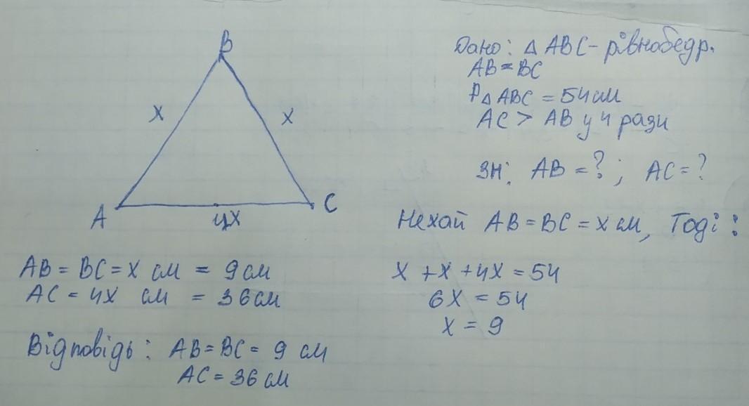 Знайдіть сторони рівнобедреного трикутника якщо його периметр 54, а основа в 4 рази більше