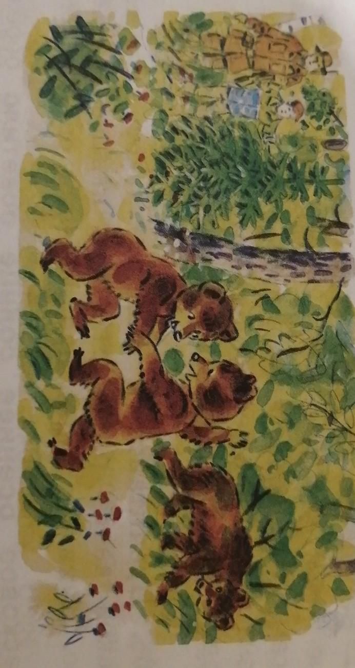 На опушке леса играют медвежата. Двое самых буйных решили подраться. Третий, умный медвежонок, отошёл от братьев подальше. Он вообще тихоня и предпочитает есть вкусные ягоды, чем драться. Косясь на них, он потихоньку отходит. Эту забавную сцену увидели старый охотник и его внук. Они остановились, боясь пошевелиться. Ведь если тут есть медвежата, то значит неподалеку и медведица.