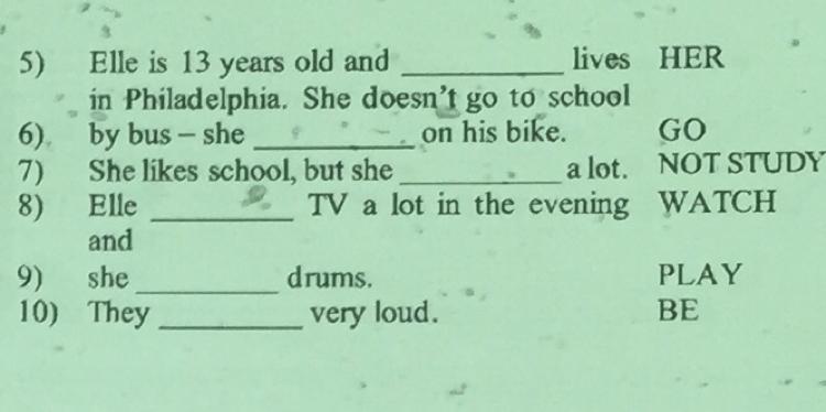 Ответ:5.Elle is 13 years old and she lives in Philadelphia.6.She doesn't go to by bus. She go on her bike.7. She likes school but she doesn't study a lot.8).Elle watches TV a lot in the evening. 9)She plays the drume.10).They play very loud.