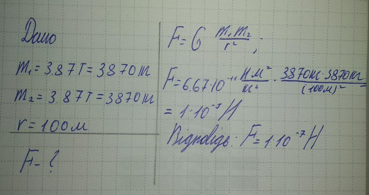 Якою буде сила взаємного притягання між двома супутниками Землі масою по 3,87 т кожен, якщо вони наблизяться один до одного на відстань 100 м.Срочно надо через 1 час сдать