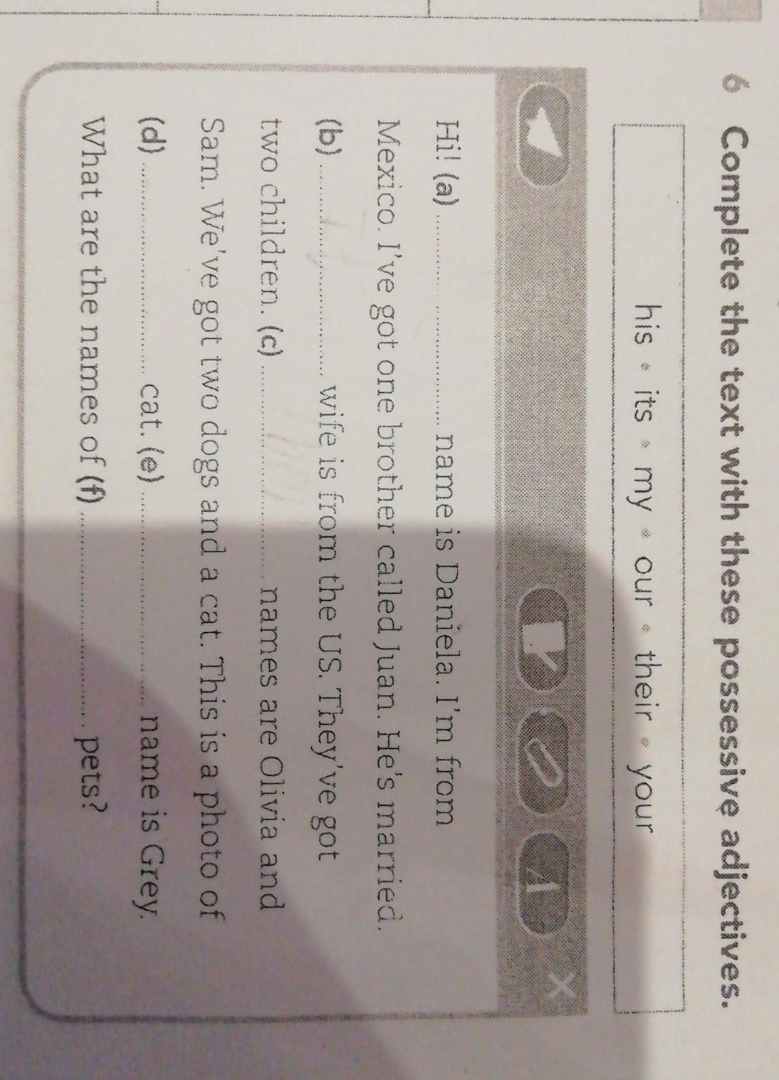 Hi! My name is Daniela. I'm from Mexico. I've got one brother called Juan. He's married. His wife from the US. They've got two children. Their names are Olivia and Sam. We've got dogs and a cat. This is photo of our cat. It's name is Grey. What are the names of your pets?