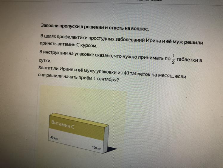 1) 40/2 = 20 (таб.) для мужа и 20 таб. для Ирины