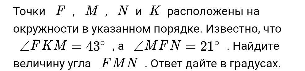 Угол KFN равен 47, а ещё треугольник FMO (О это центр, где пересекаются FN и MK). А значит FMO равен 69 градусов. Треугольники FMO OMN подобны, а значит общий угол равен 69+69=138