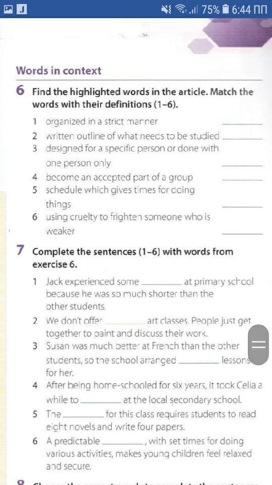 1 formal 2 syllabus 3 individual 4 fit in 5 timetable 6 bullying