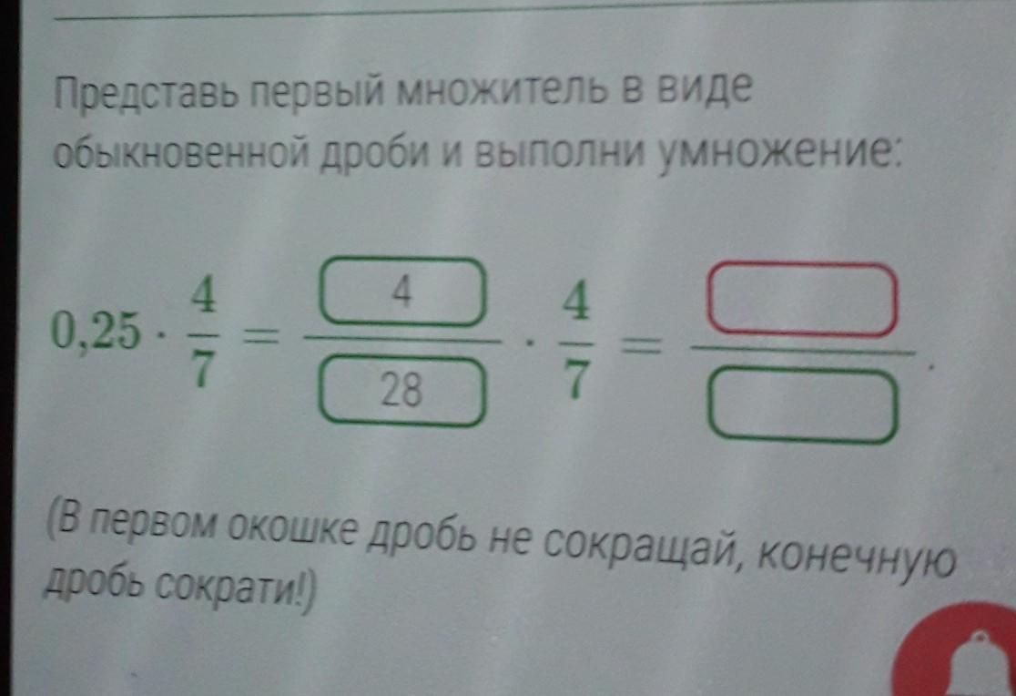 0,25 × 4/7 = 1/4 × 4/7 = 1/7.