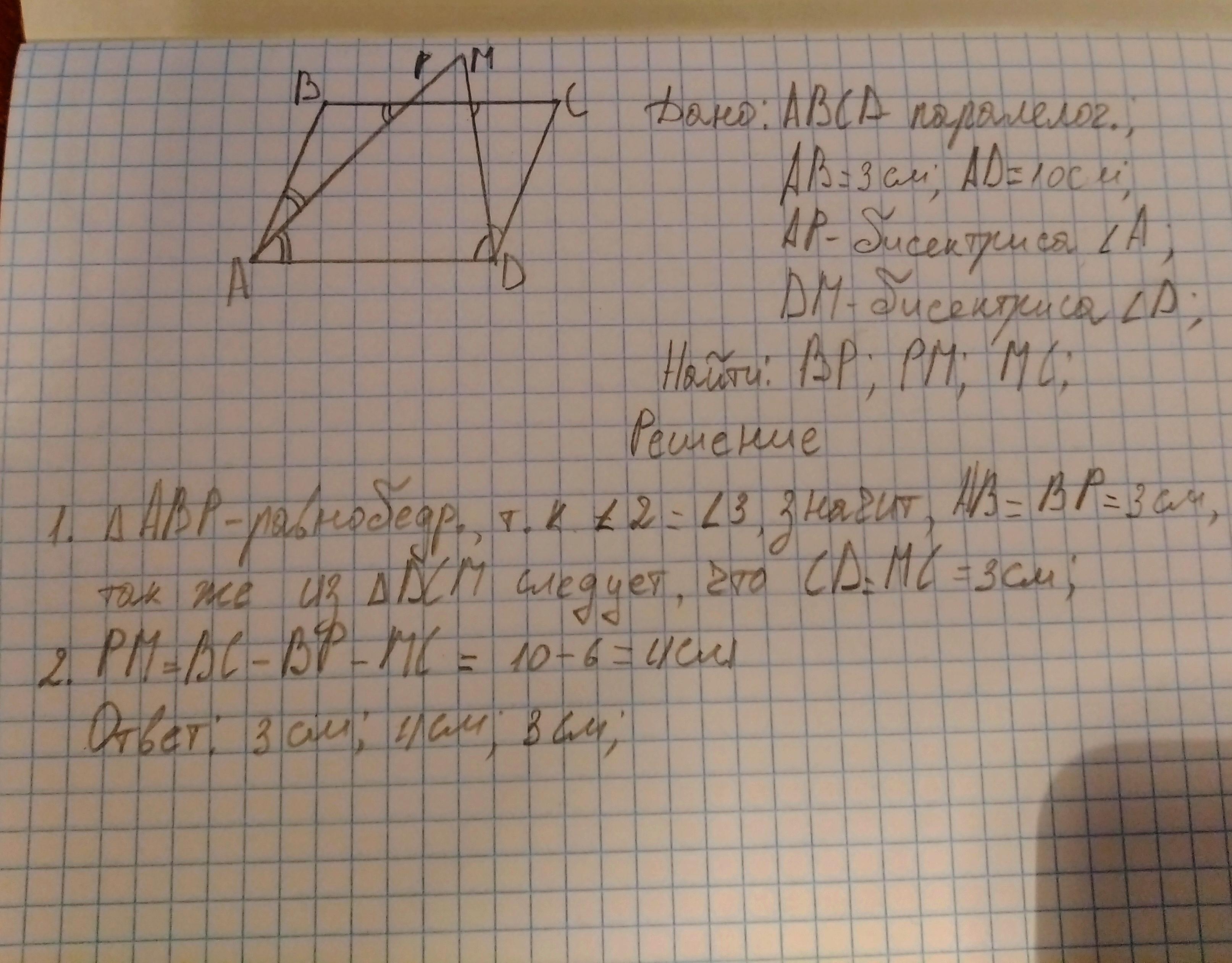 параллелограмм АВСД, АД=ВС=10, АВ=СД=3, АК-биссектриса углаА, ДН-биссектриса углаД, уголКАД=уголАКБ как внутренние разносторонние =уголКАВ , треугольник АВК равнобедренный АВ=ВК=3, уголАДН=уголСНД как внутренние разносторонние =уголНДС, треугольникНДС равнобедренный ДС=СН=3, КН=ВС-ВК-НС=10-3-3=4, отрезки 3, 4,3