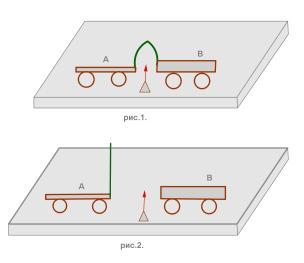 После того как нить, связывающую тележки, пережгли, они разъехались с разными скоростями (рис. 2).