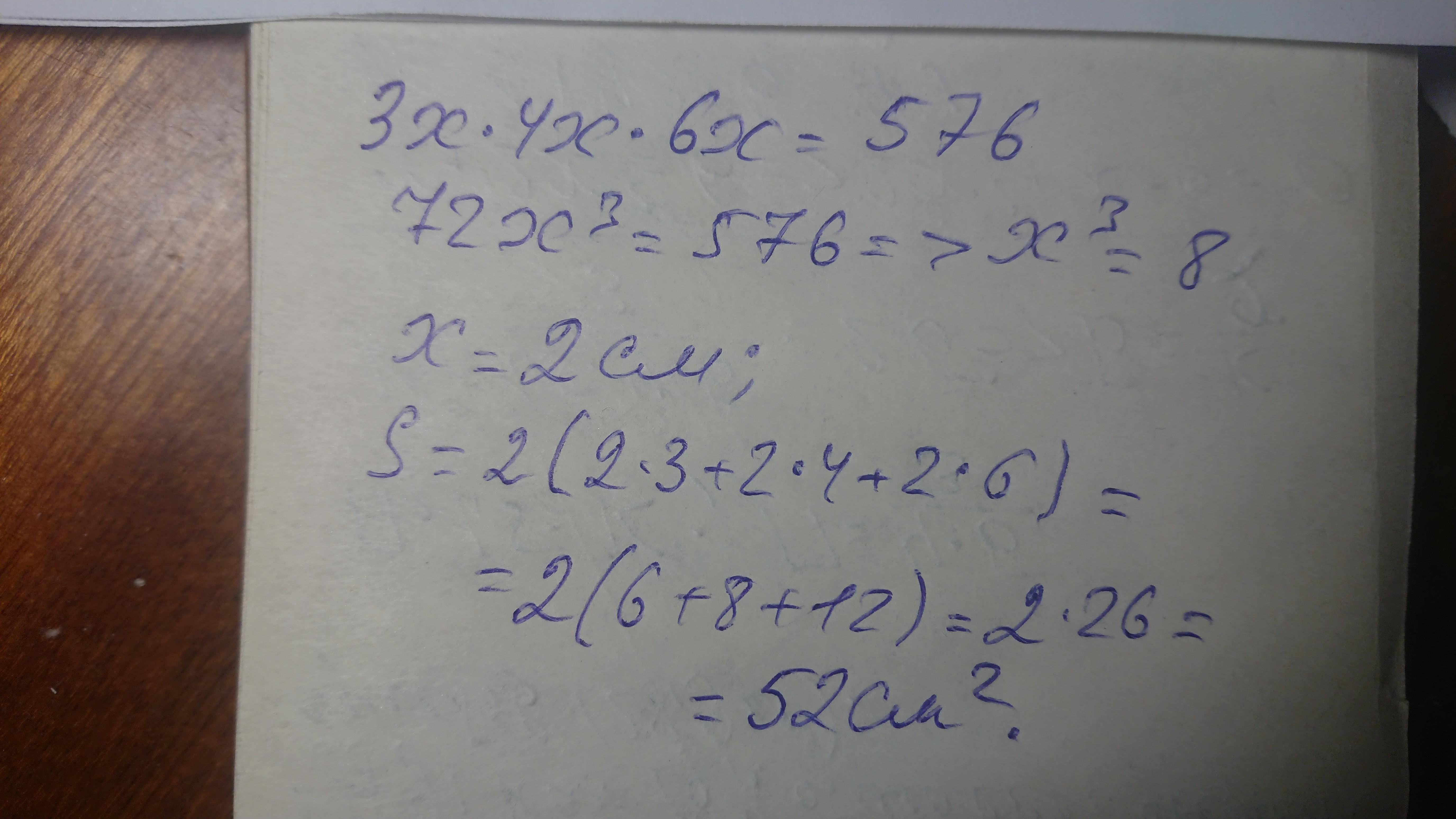 Ответ: 3*х*4*х*6*х=576 см^3⇒72*x^3=576⇒x^3=576/72=8⇒x=2 см. Длины сторон параллелепипеда равны 2*3=6 см, 2*4=8 см, 2*6=12 см. Площадь поверхности равна 2*(6*8+6*12+8*12)=2*(48+72+96)=2*216=432 см^2.