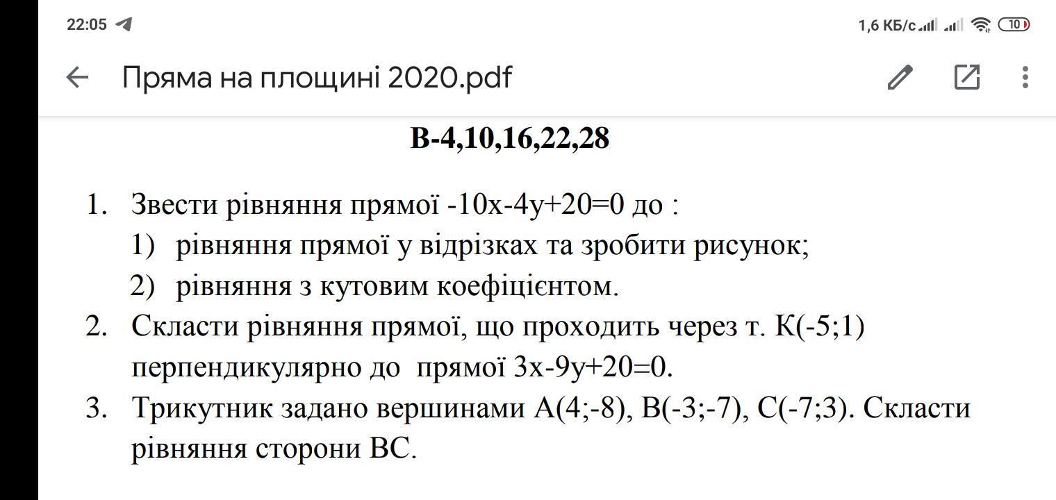 1. Дано уравнение -10х - 4у + 20 = 0.