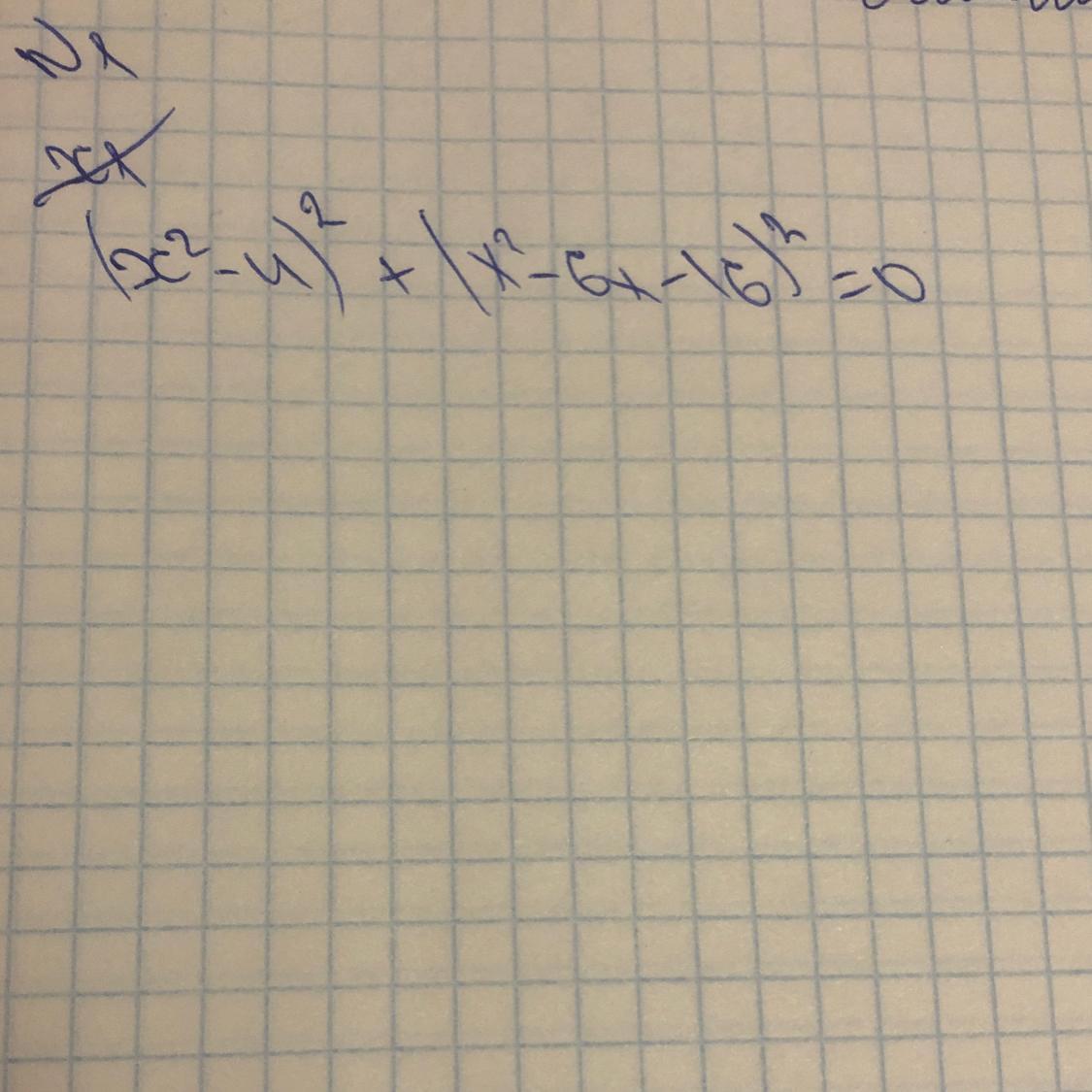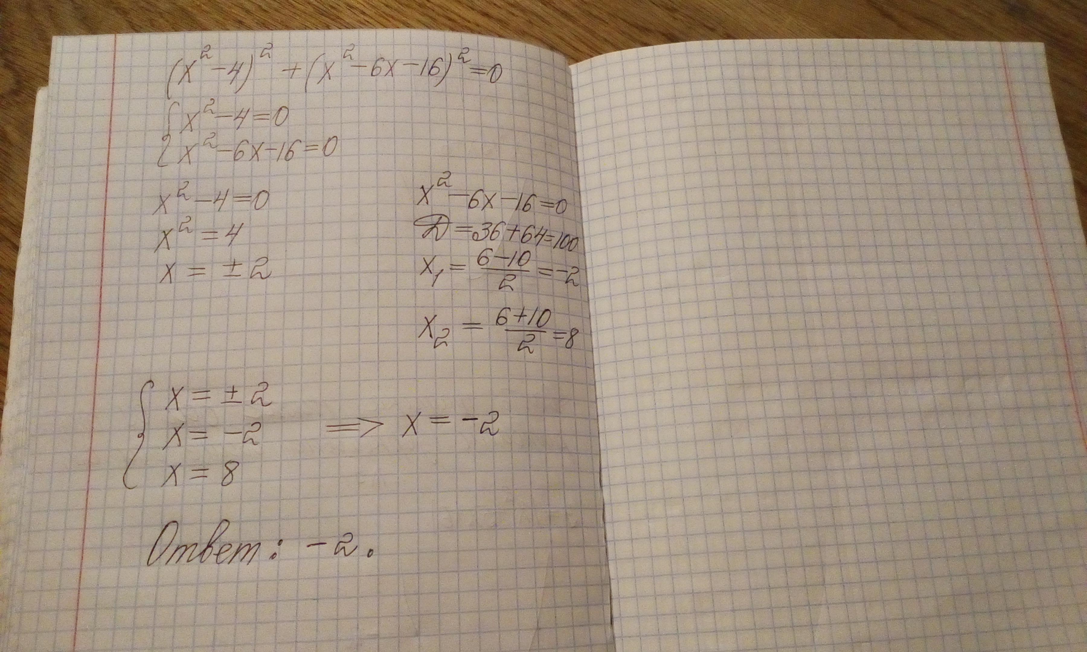 (х² - 4)² + (х² - 6х - 16)² = 0
