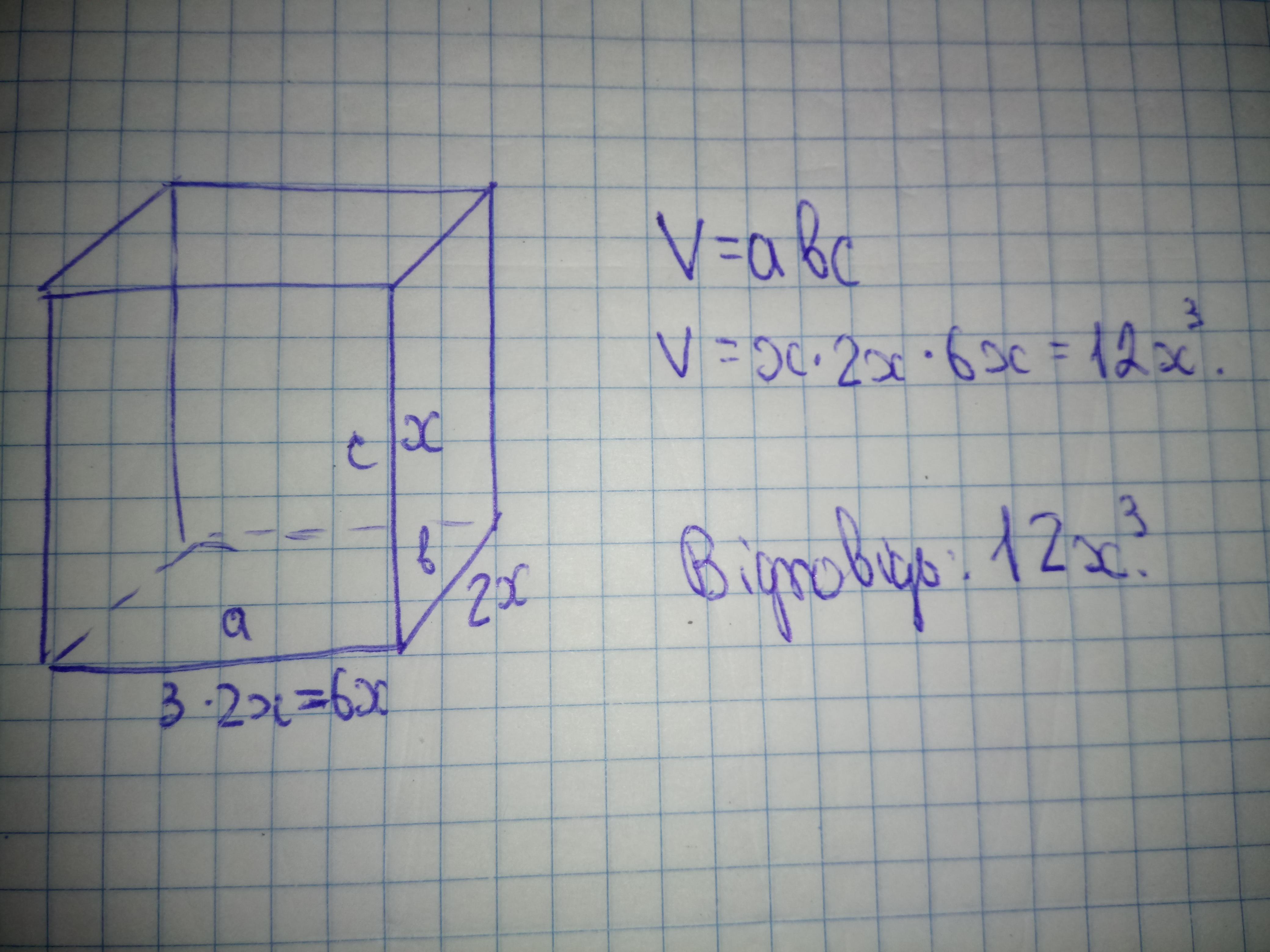 Знайдіть об’єм басейну, що має форму прямокутного паралелепіпеда, висота якого дорівнює x м, ширина у 2 рази більша за висоту, а довжина у 3 рази більша за ширину.