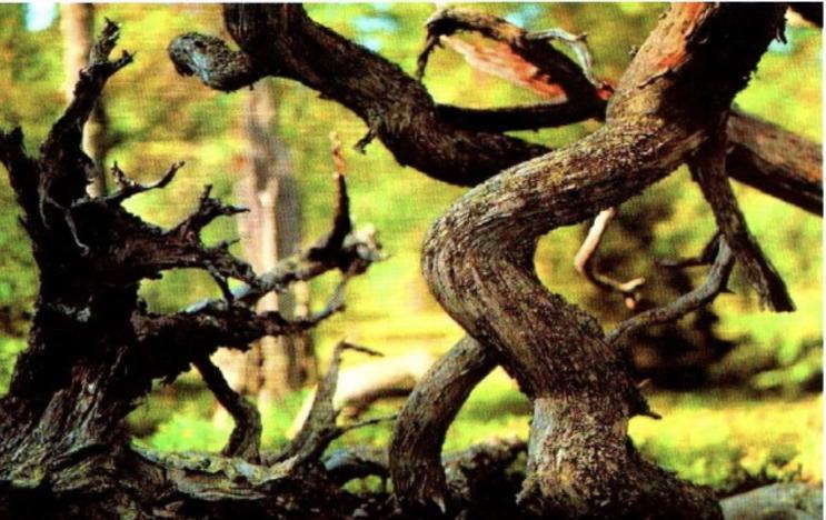 На переднем плане выступают корявые, уже испорченные корни. На верхушку ближайшего корня падает луч света и из-за этого корень немного оранжевый, и выглядит менее мрачно.