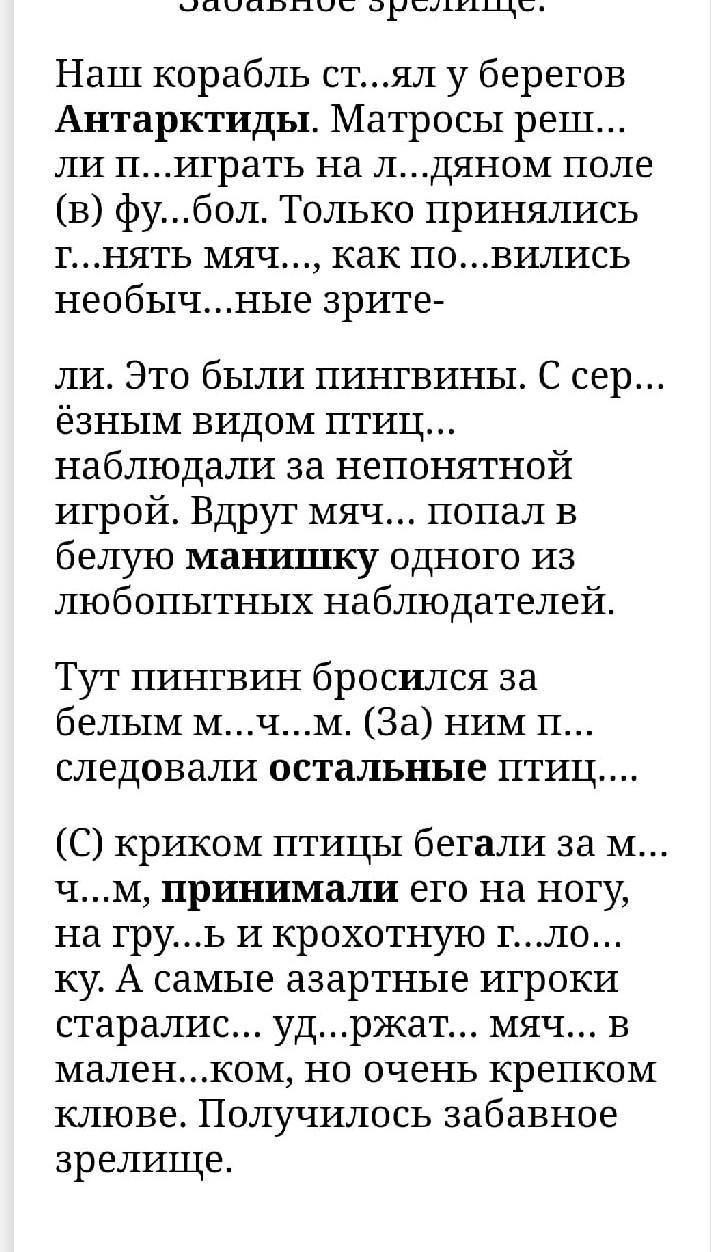 Наш корабль стоял у берегов Антарктиды. Матросы решили поиграть на ледяном поле в футбол. Только принялись гонять мяч, как появились необычные зрители. Это были пингвины. С серьёзным видом птицы наблюдали за непонятной игрой. Вдруг мяч попал в белую манишку одного из любопытных наблюдателей.