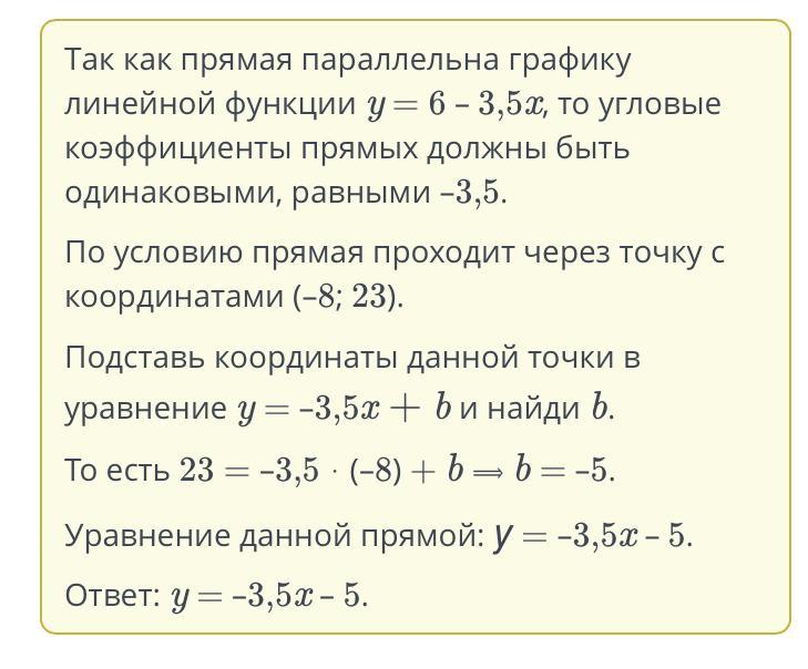 Задай формулой прямую, проходящую через точку (-8; 23) параллельно прямой у = 6 – 3,5х.