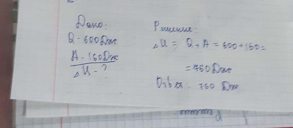 Найдите, насколько изменилась внутренняя энергия газа, если в тепловом двигателе газ получил 600 Дж тепла и совершил работу 160 Дж.