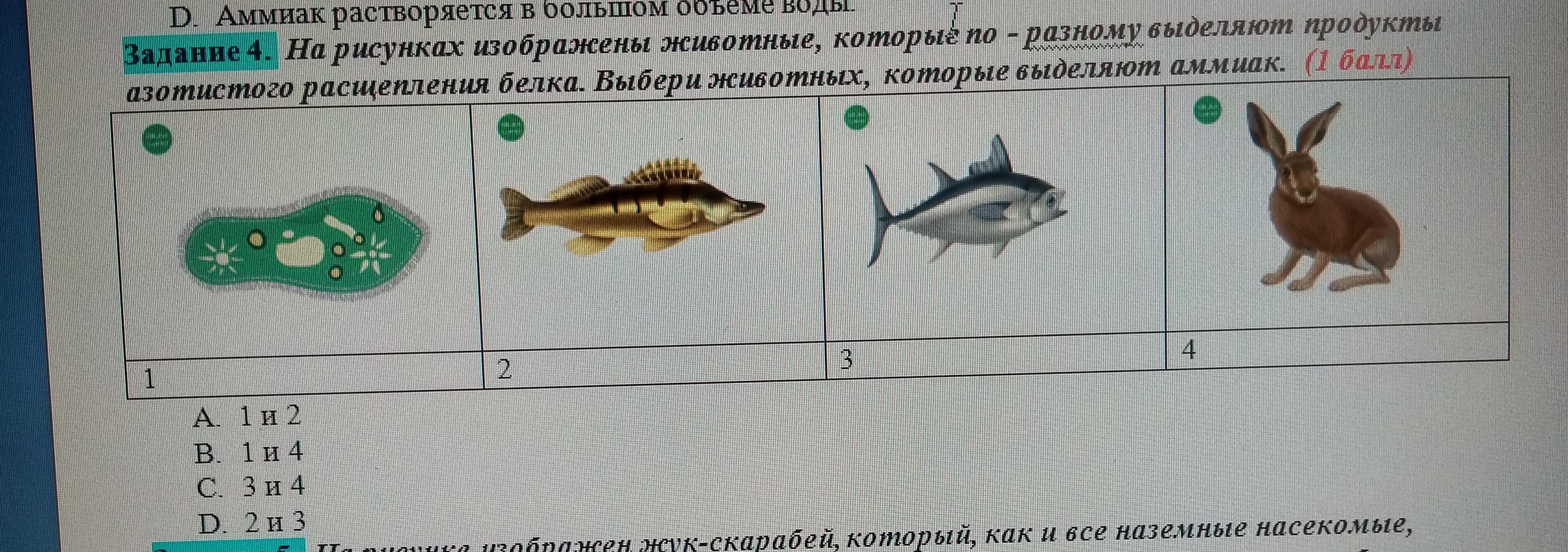 На рисунках изображены животные, которые по - разному выделяют продукты азотистого расщепления белка. Выбери животных, которые выделяют аммиак.