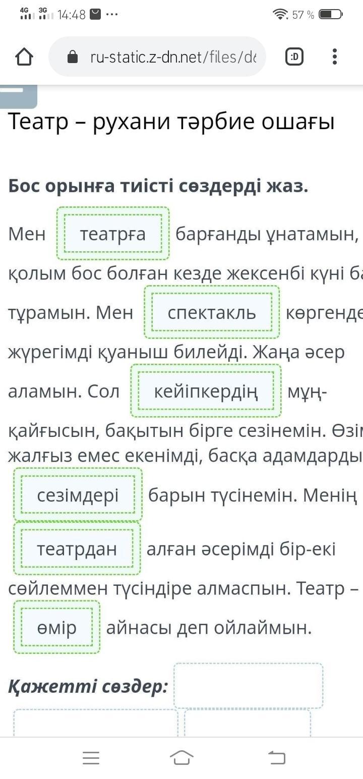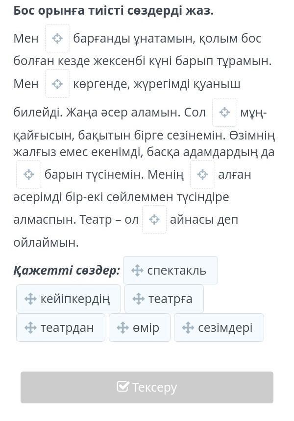 алған әсерімді бір-екі сөйлеммен түсіндіре алмаспын. Театр – ол___