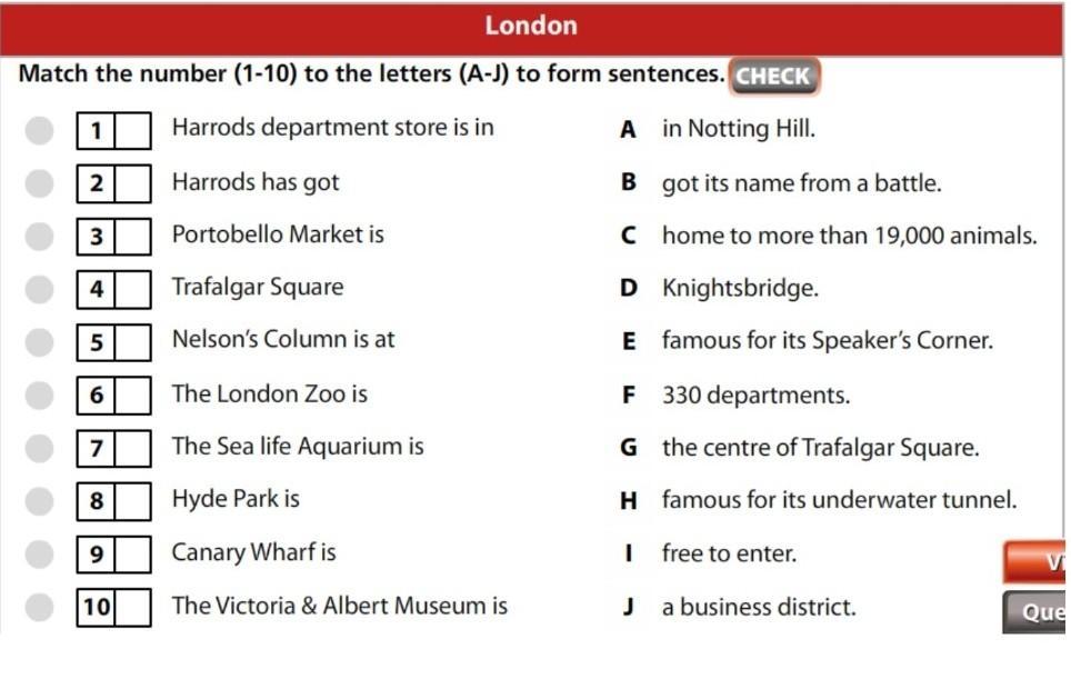 Match the number (1-10) to the letters (A-J) to form sentences. CHECK