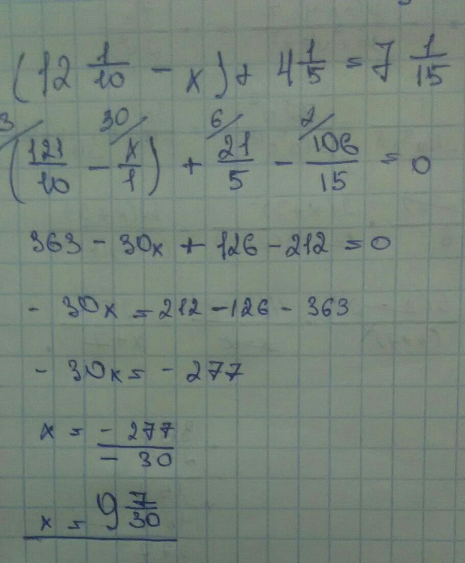 решите уравнение (12 1/10-х)+4 1/5=7 1/15 помогите Срочно пожалуйста
