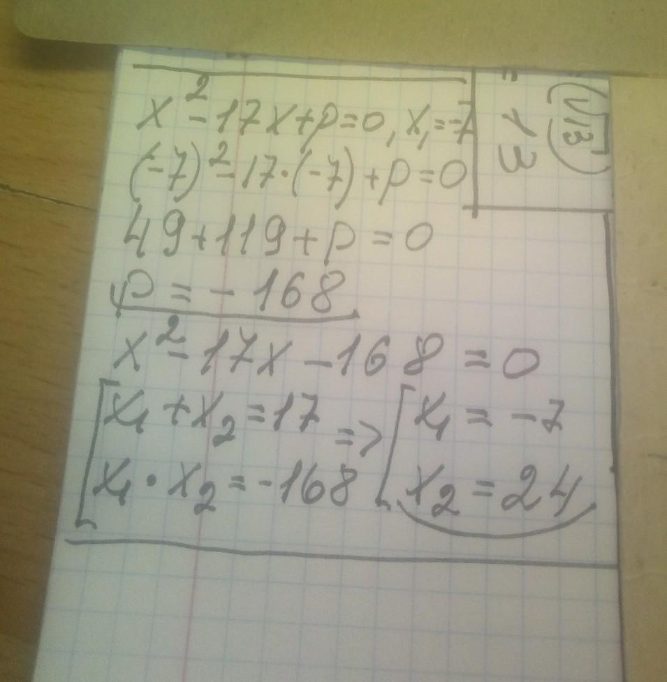 Число -7 является корнем управления х²-17х+p=0.Найдите второй корень уравнения и значение p,используя теорему Виета ?