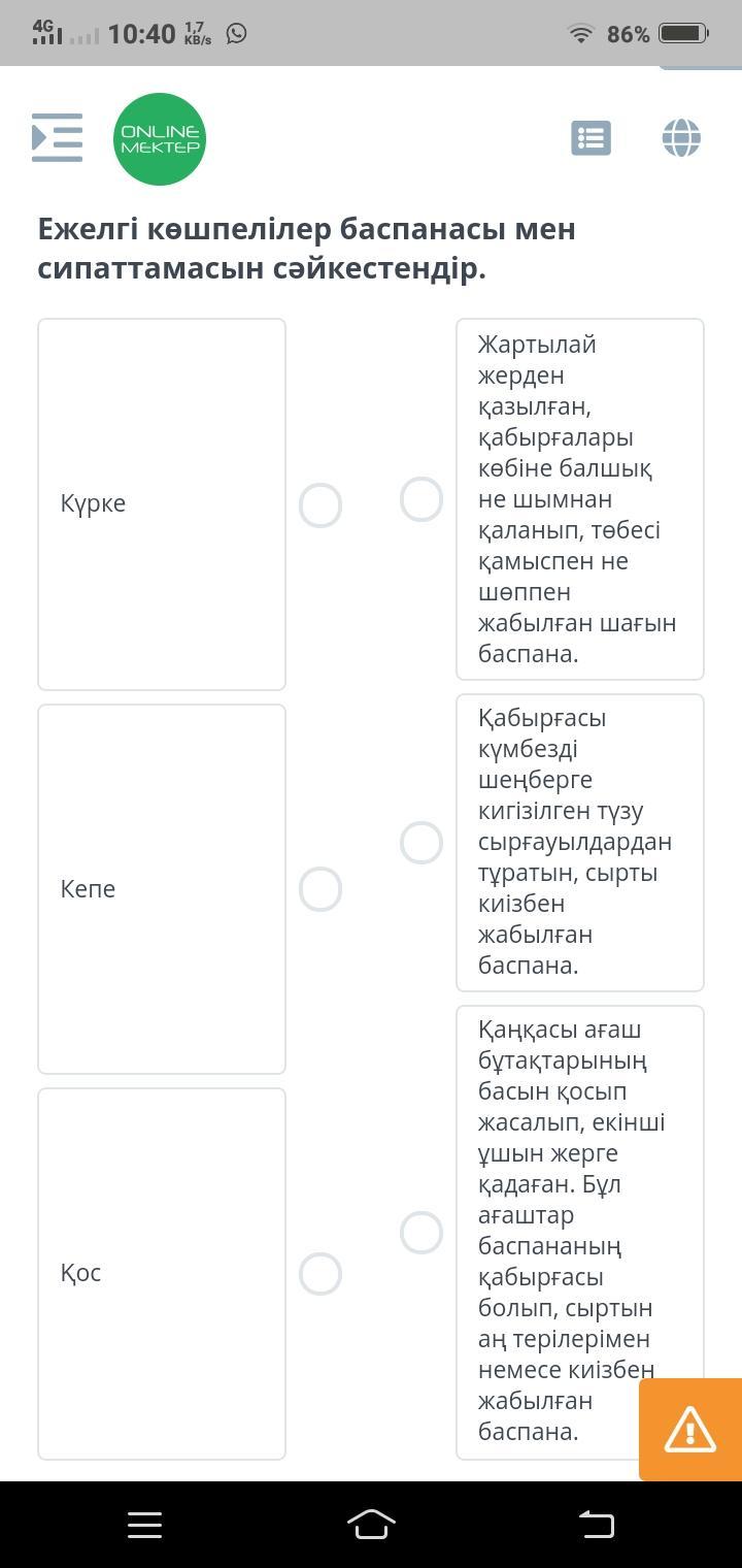 Ежелгі көшпелілер баспанасы мен сипаттамасын сәйкестендір.