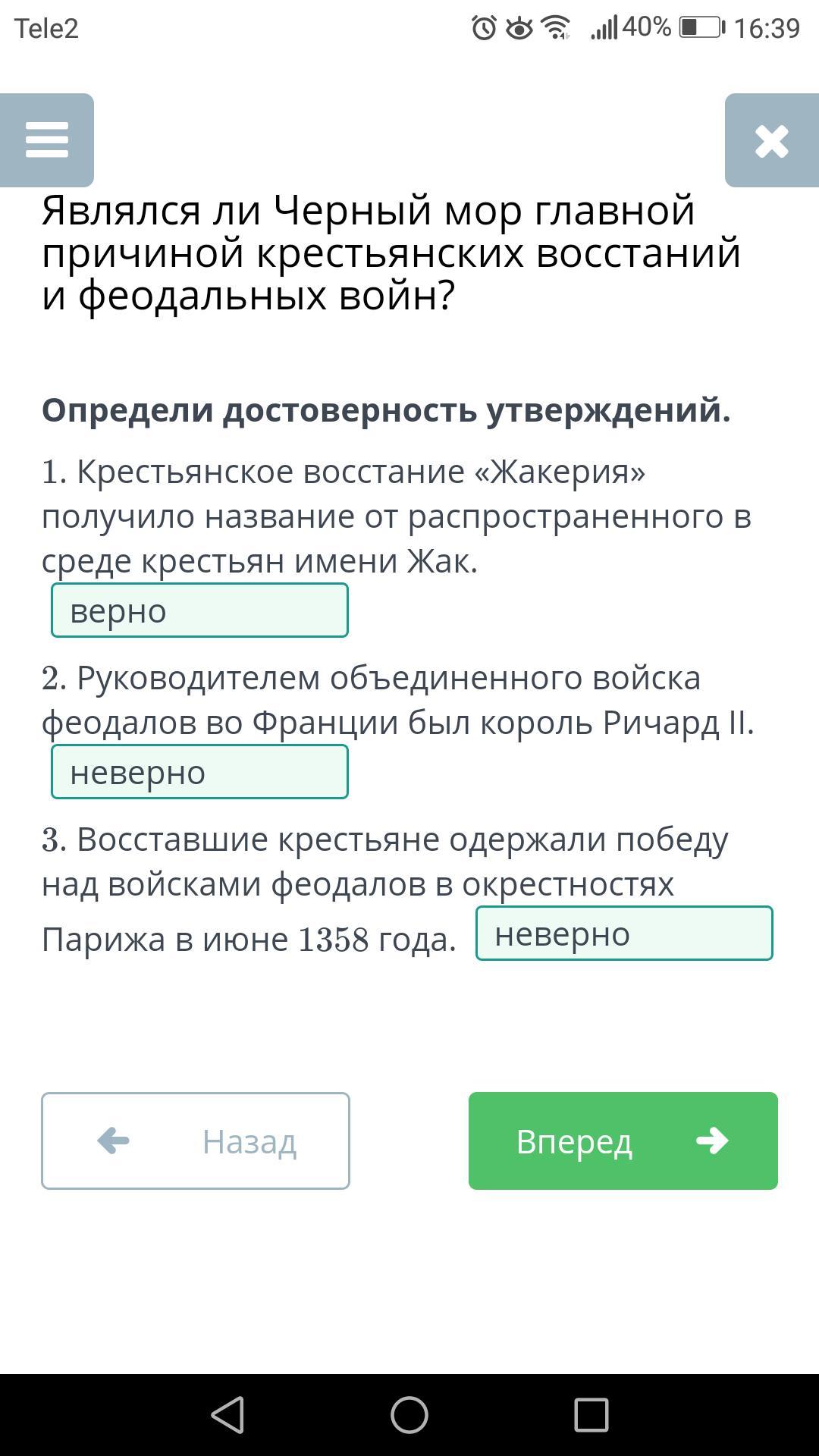 Определи достоверность утверждений. 1. Крестьянское восстание «Жакерия» получило название от распространенного в среде крестьян имени Жак. 2. Руководителем объединенного войска феодалов во Франции был король Ричард II. 3. Восставшие крестьяне одержали победу над войсками феодалов в окрестностях Парижа в июне 1358 года.