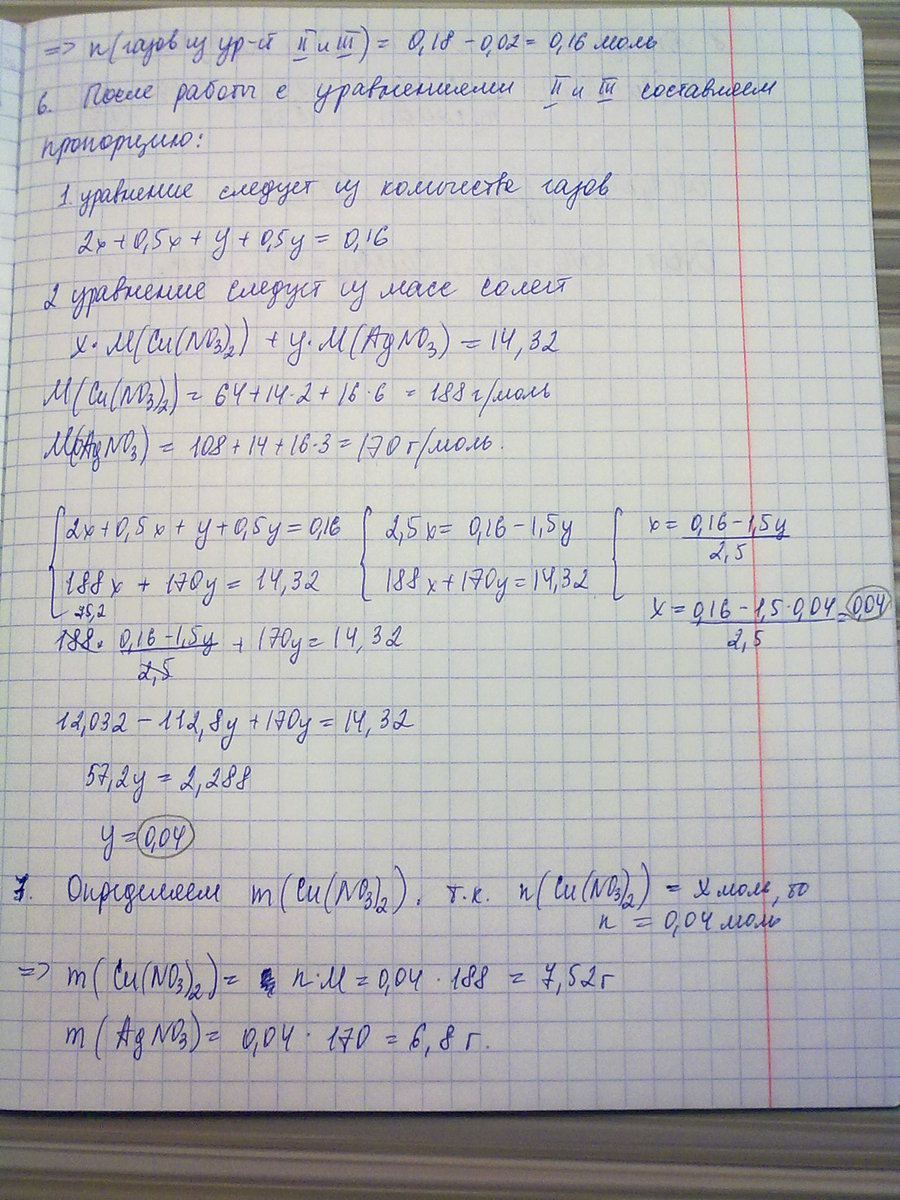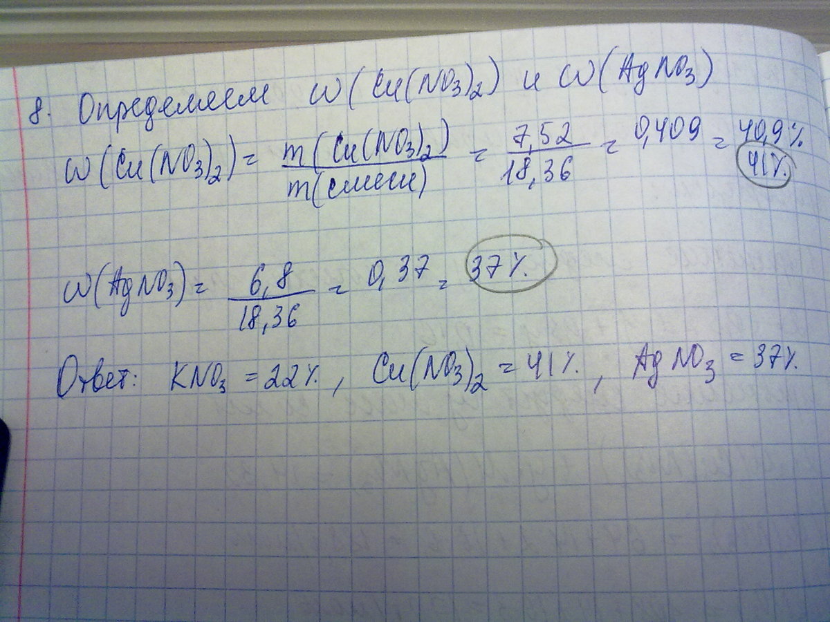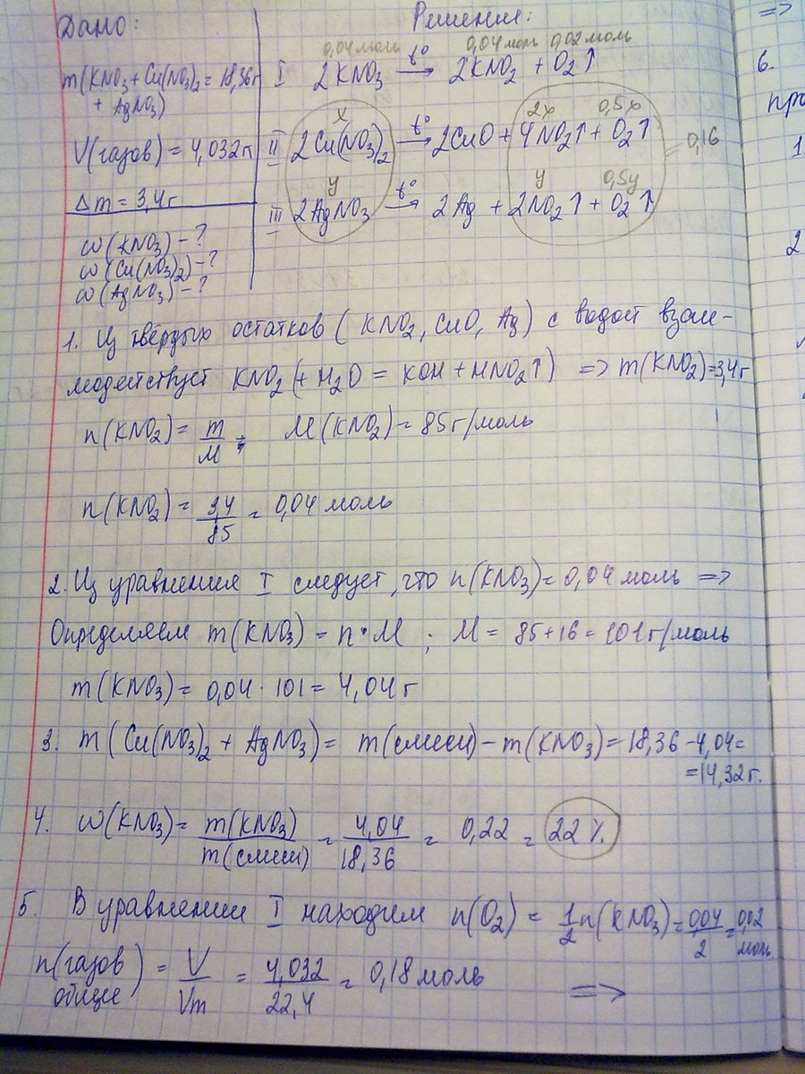 Смесь нитратов Калия, Купрума, Аргентума массой 18,36г прокалили. Объём выдилившихся газов составил 4,032 л (н.у.). Твёрдый остаток обработали водой, после чего его масса уменьшилась на 3,4 г. Вычислить состав смеси нитратов.