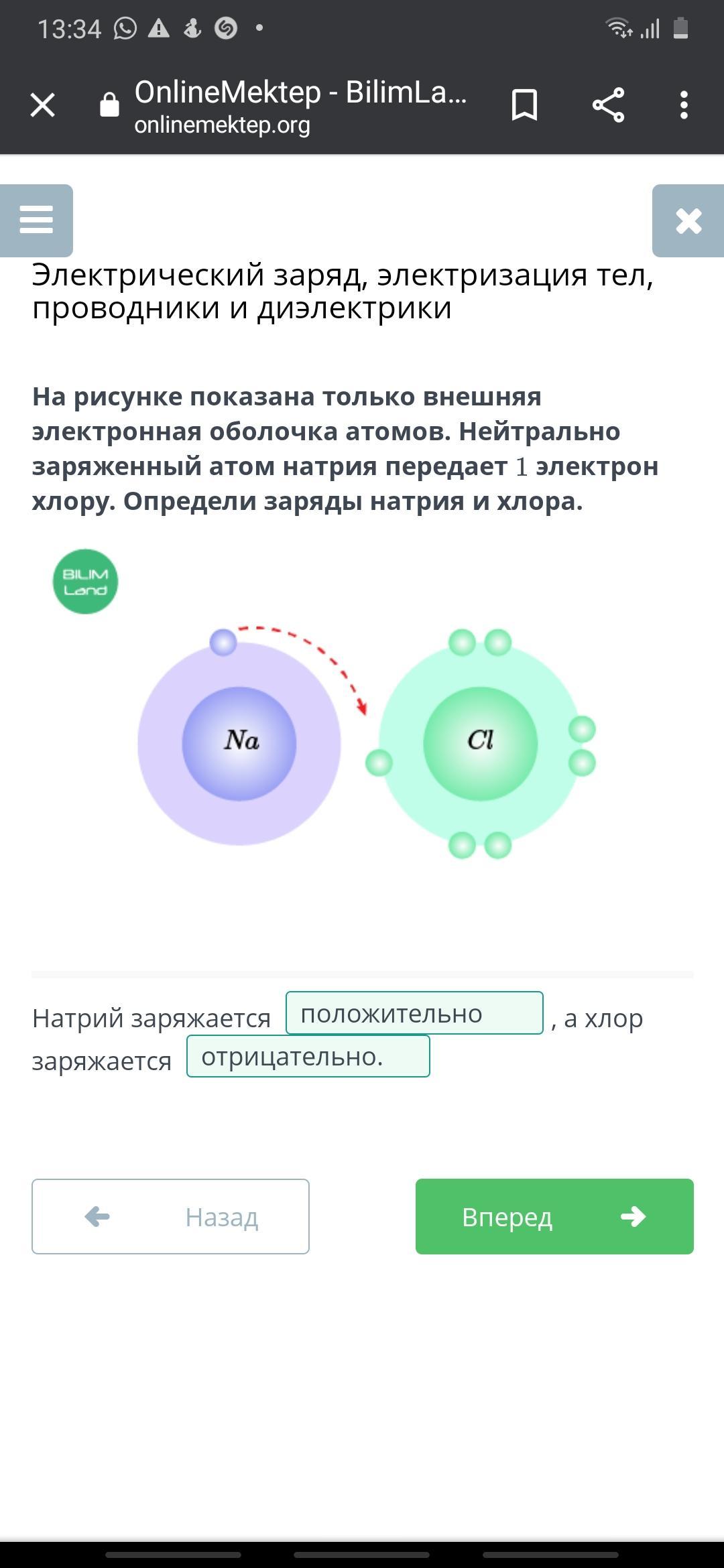 На рисунке показана только внешняя электронная оболочка атомов. Нейтрально заряженный атом натрия передает 1 электрон хлору. Определи заряды натрия и хлора. Натрий заряжается , а хлор заряжается