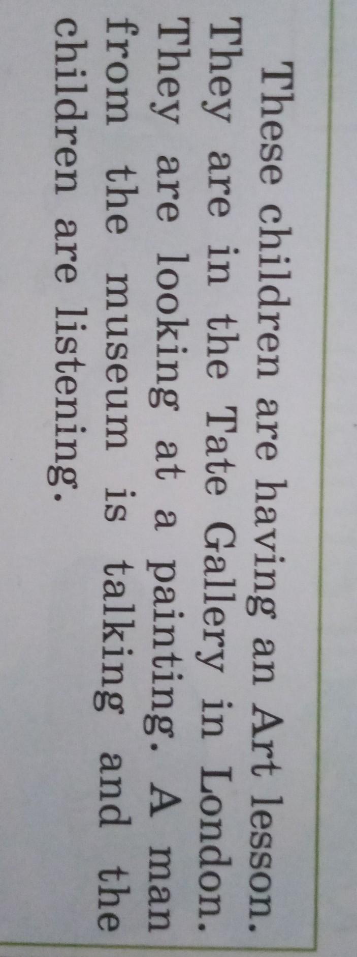 У этих детей сейчас урок искусств. Они в Тейт в Лондоне. Они смотрят на картину. Мужчина из музея говорит и дети его слушают.