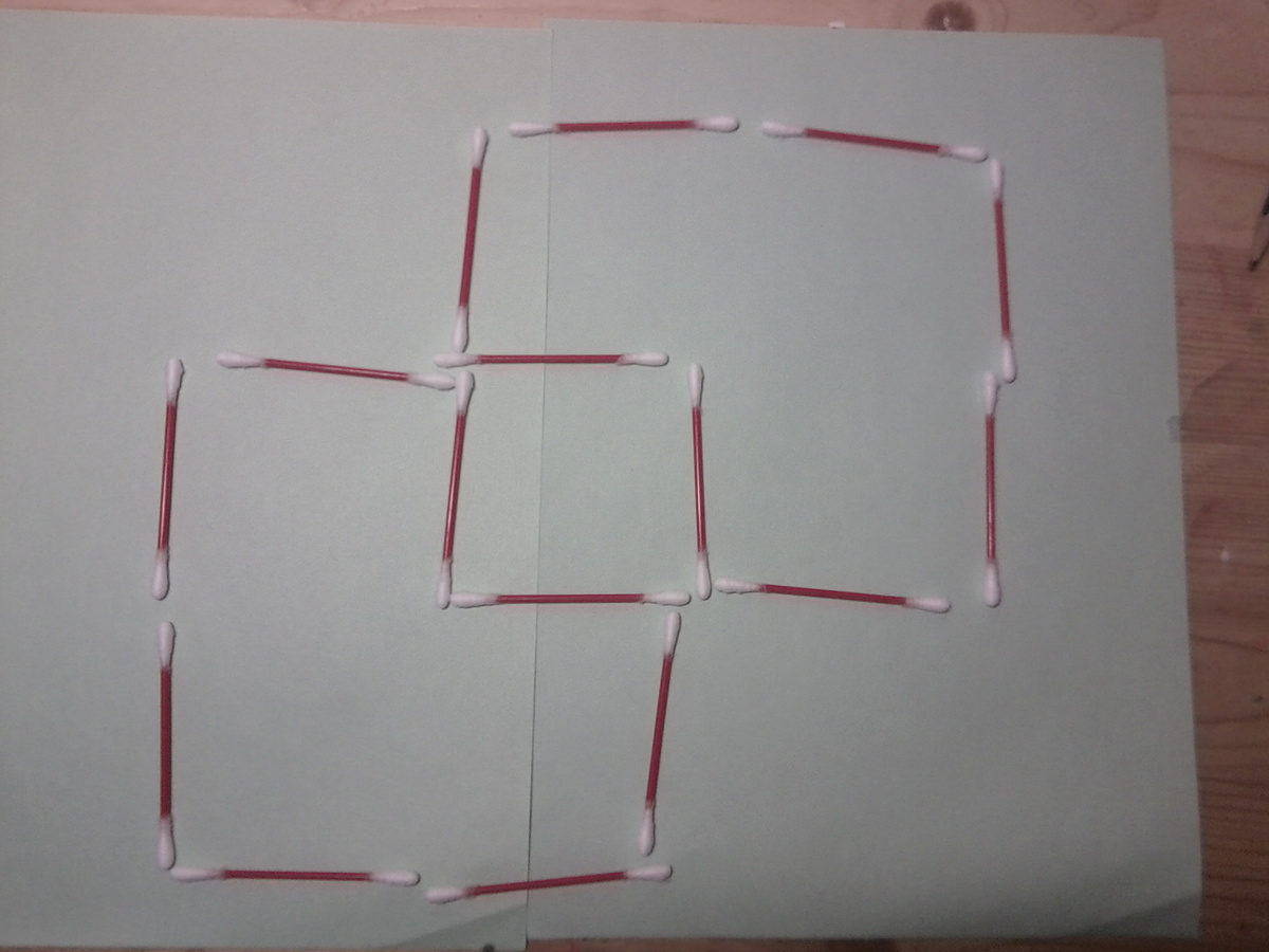 я решила так. Из нижних двух берётся середина и перекладина и из двух боковых так же. Получается 2 больших квадрата накладываются друг на друга углом.