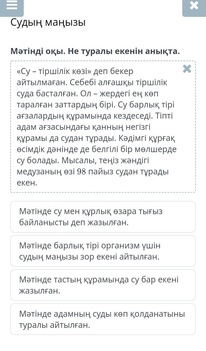 2)Барлык тірі организм үшін судың мағызы зор екені айтылған