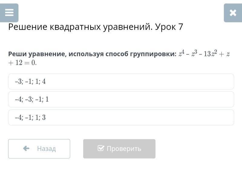 Реши уравнение, используя способ группировки: z4 – z3 – 13z2 + z + 12 = 0.