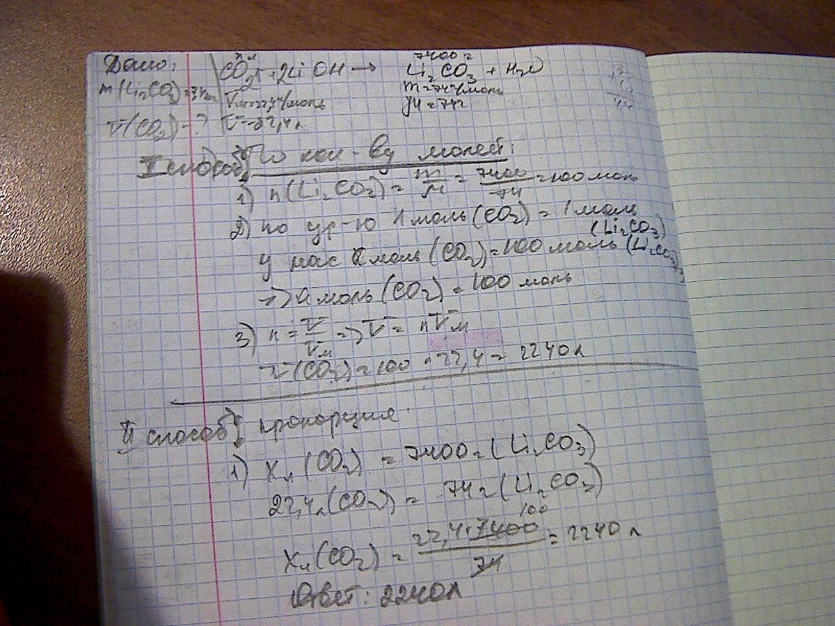 На космическом корабле поглощение оксида углерода(IV) осуществляется сухим гидроксидом лития.Какой объем оксида углерода(IV) (н.у.) поглотится,если в результате реакции образуется 7,4 кг карбоната лития?