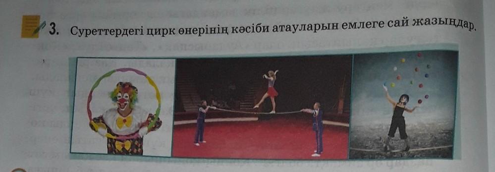3. Суреттердегі цирк өнерінің кәсіби атауларын емлеге сай жазыңдар.