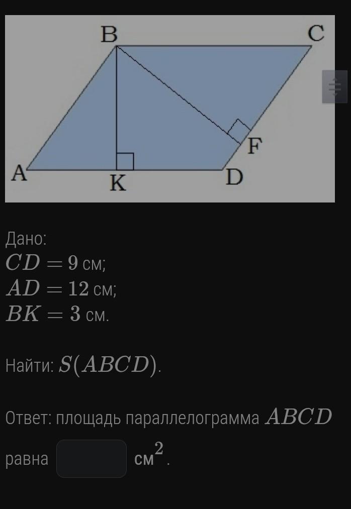 S(ABCD) = 1/2 AD * BK = 1/2 * 12 * 3 = 18(см²)