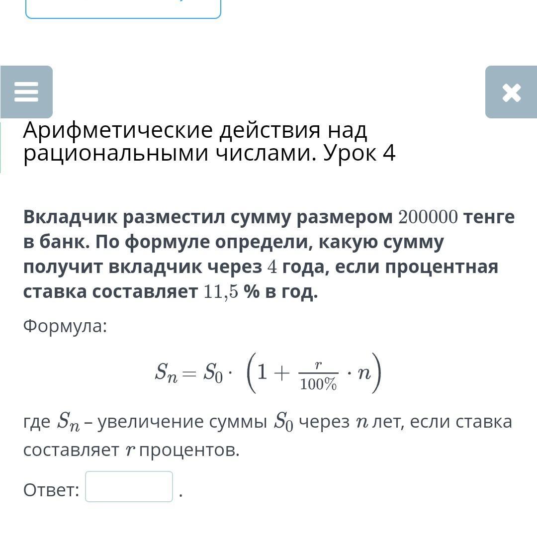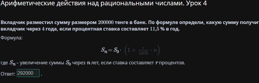 Вкладчик разместил сумму размером 200000 тенге в банк. По формуле определи, какую сумму получит вкладчик через 4 года, если процентная ставка составляет 11,5 % в год.