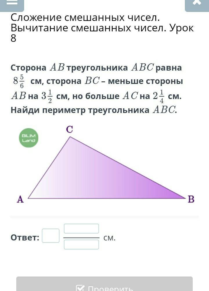 стороны AB треугольника ABC равна 8 5/6 см сторона BC меньше стороны AB на 3 1/2 см Но больше AB на 2 1/4 см Найди периметр треугольника ABC