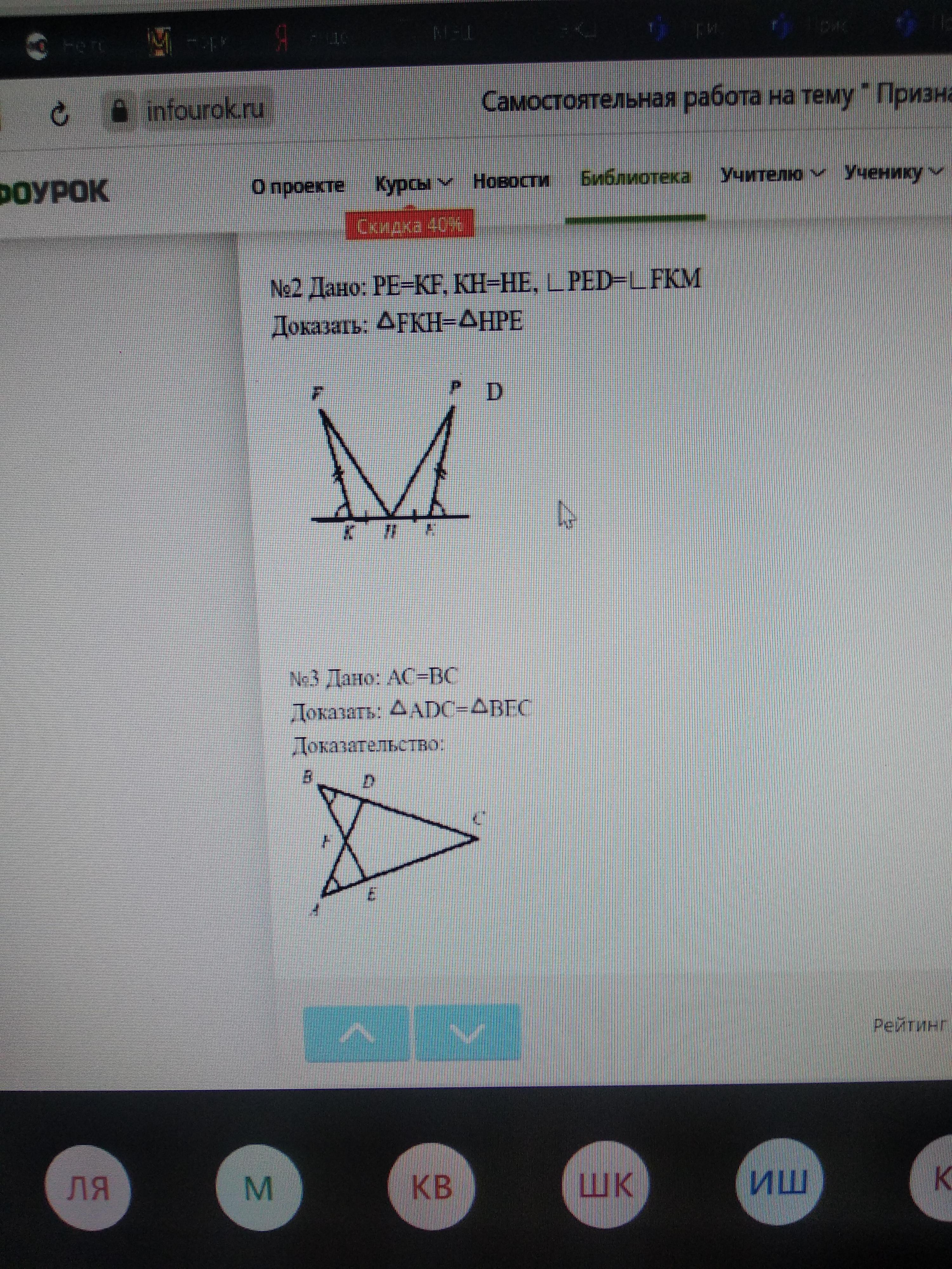 Объяснение:В зад.2 две стороны одного треугольника и угол между ними равны 2 сторонам и углу между ними второго треугольника . Значит они равны.
