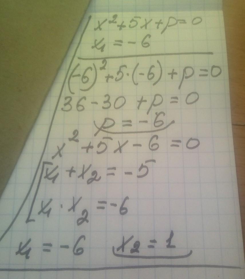 Число –6 является корнем уравненияx^2+5x+p. Найдите второй корень уравнения и значение p, используя теорему Виета.