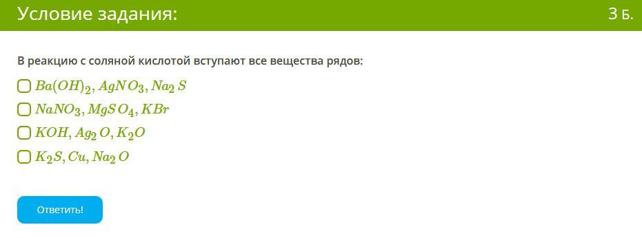 В реакцию с соляной кислотой вступают все вещества рядов: