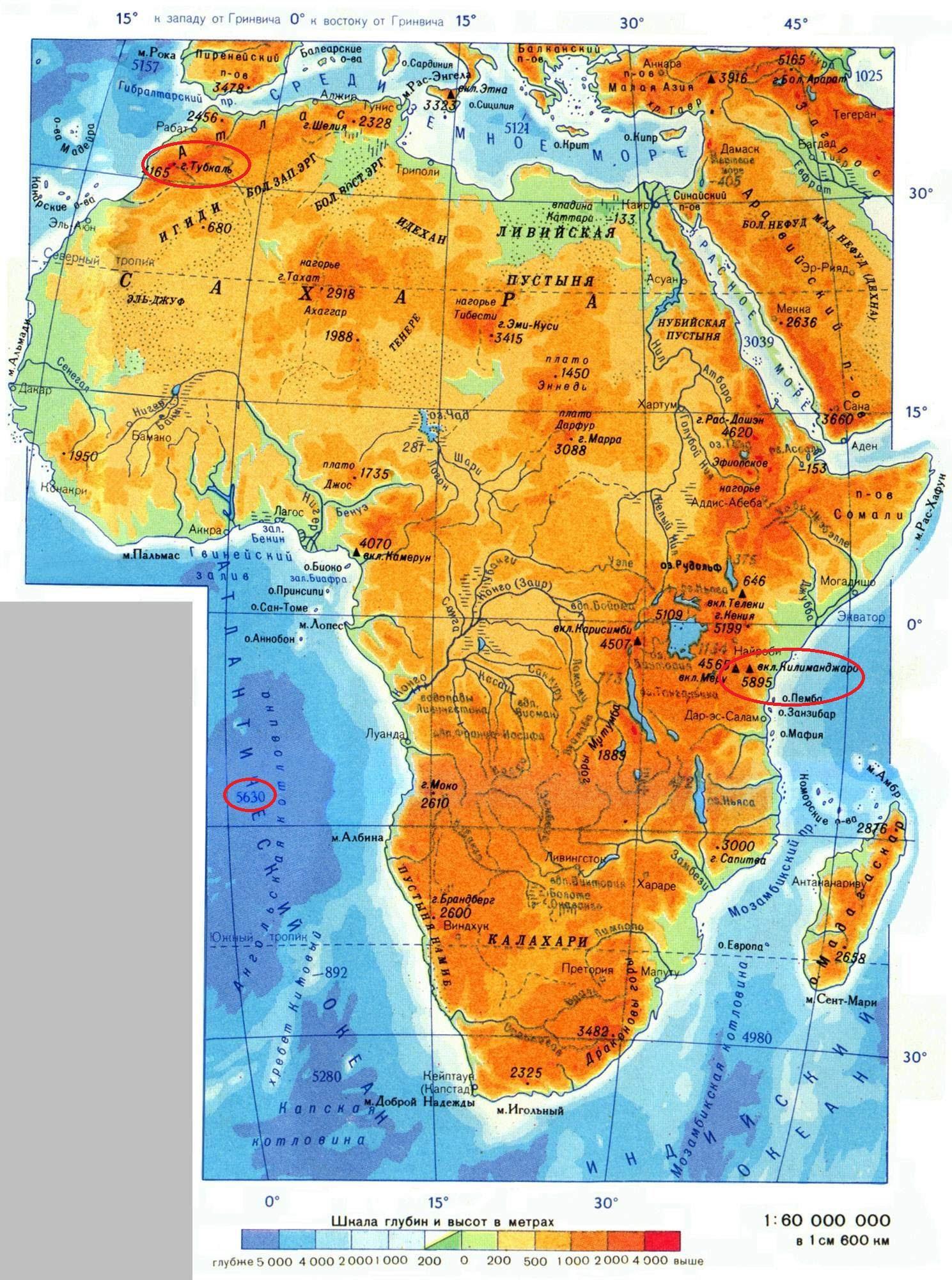 На физических картах высоты и глубины отдельных точек изображают отметками.Возьмём к примеру физическую карту Африки.На северо-востоке расположены горы Атлас и обозначена самая высокая точка гора Тубкаль с высотой 4165 м.На востоке вулкан Килиманджаро отмечен точкой 5895 м.На западе в Атлантическом океане Ангольская котловина с самой глубокой точкой -5630 м.