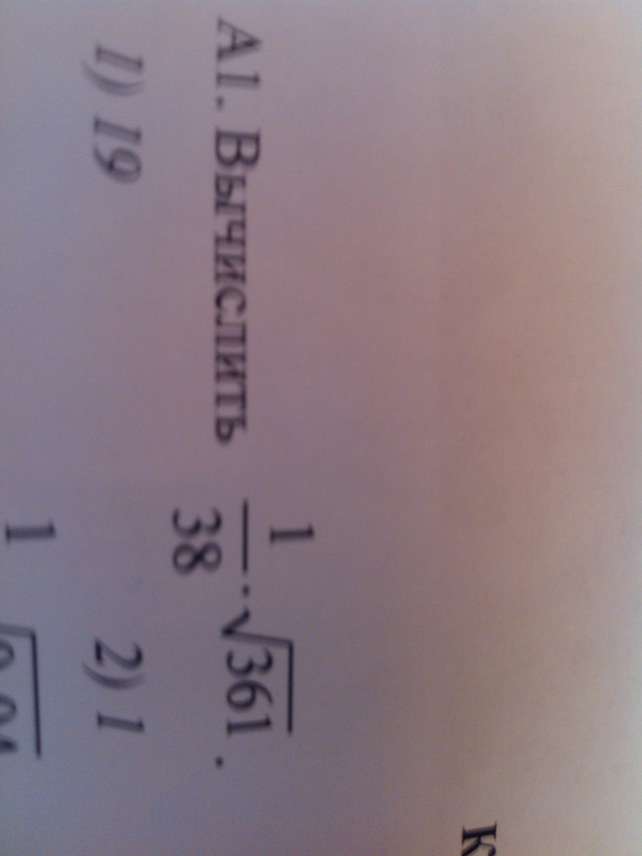 1/38 * корень из 361= (весь пример восзводим во вторую степень,что бы избавиться от корня, получится) =1/1444 * 361. затем 1444 делим на 361(сокращаем). получится 1/4 или 0,25
