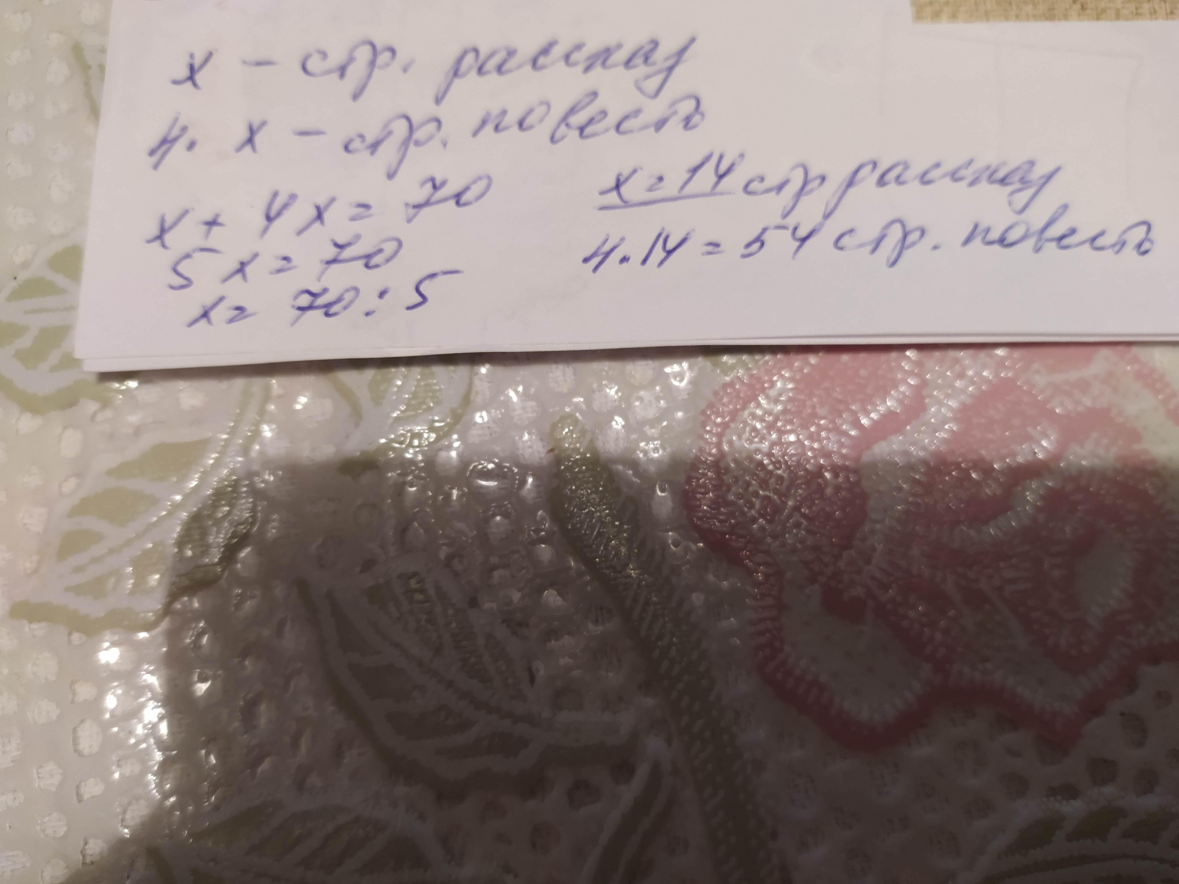 В книге напечатаны рассказ и повесть , которые вместе занимают 70 страниц. Повесть занимает в 4 раза больше страниц, чем рассказ. Сколько страниц занимает рассказ и сколько повесть?