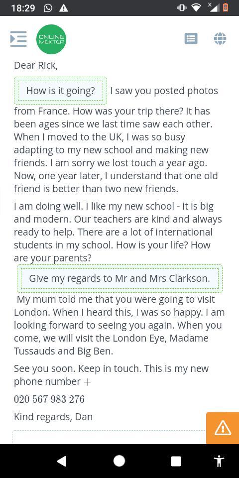 Read the letter to a friend and drag the missing sentences. 117 Russel Road 25 Braco St. Ottawa 09HG56 Dear Rick, I saw you posted photos from France. How was your trip there? It has been ages since we last time saw each other. When I moved to the UK, I was so busy adapting to my new school and making new friends. I am sorry we lost touch a year ago. Now, one year later, I understand that one old friend is better than two new friends. I am doing well. I like my new school - it is big a regardsnd modern. Our teachers are kind and always ready to help. There are a lot of international students in my school. How is your life? How are your parents? My mum told me that you were going to visit London. When I heard this, I was so happy. I am looking forward to seeing you again. When you come, we will visit the London Eye, Madame Tussauds and Big Ben. See you soon. Keep in touch. This is my new phone number + 020 567 983 276 Kind regards, Dan.Give my