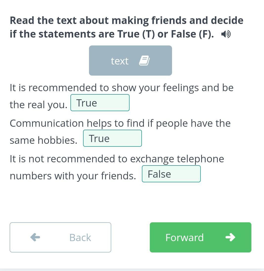 Read the text about making friends and decide if the statements are True (T) or False (F).