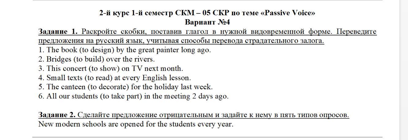 Ответ:1. The book to design by the great painter long ago. 2. Bridges (to build) over the rivers. 3. This concert to show on TV next month. 4. Small texts to read at every English lesson. 5. The canteen to decorate for the holiday last week. 6. All our students to take part in the meeting 2 days ago.