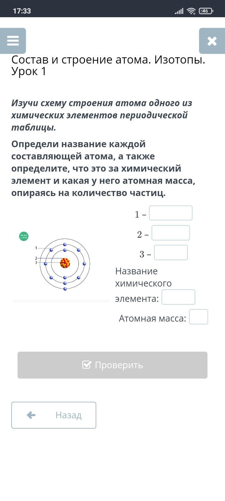 Определи название каждой составляющей атома, а также определите, что это за химический элемент и какая у него атомная масса, опираясь на количество частиц.
