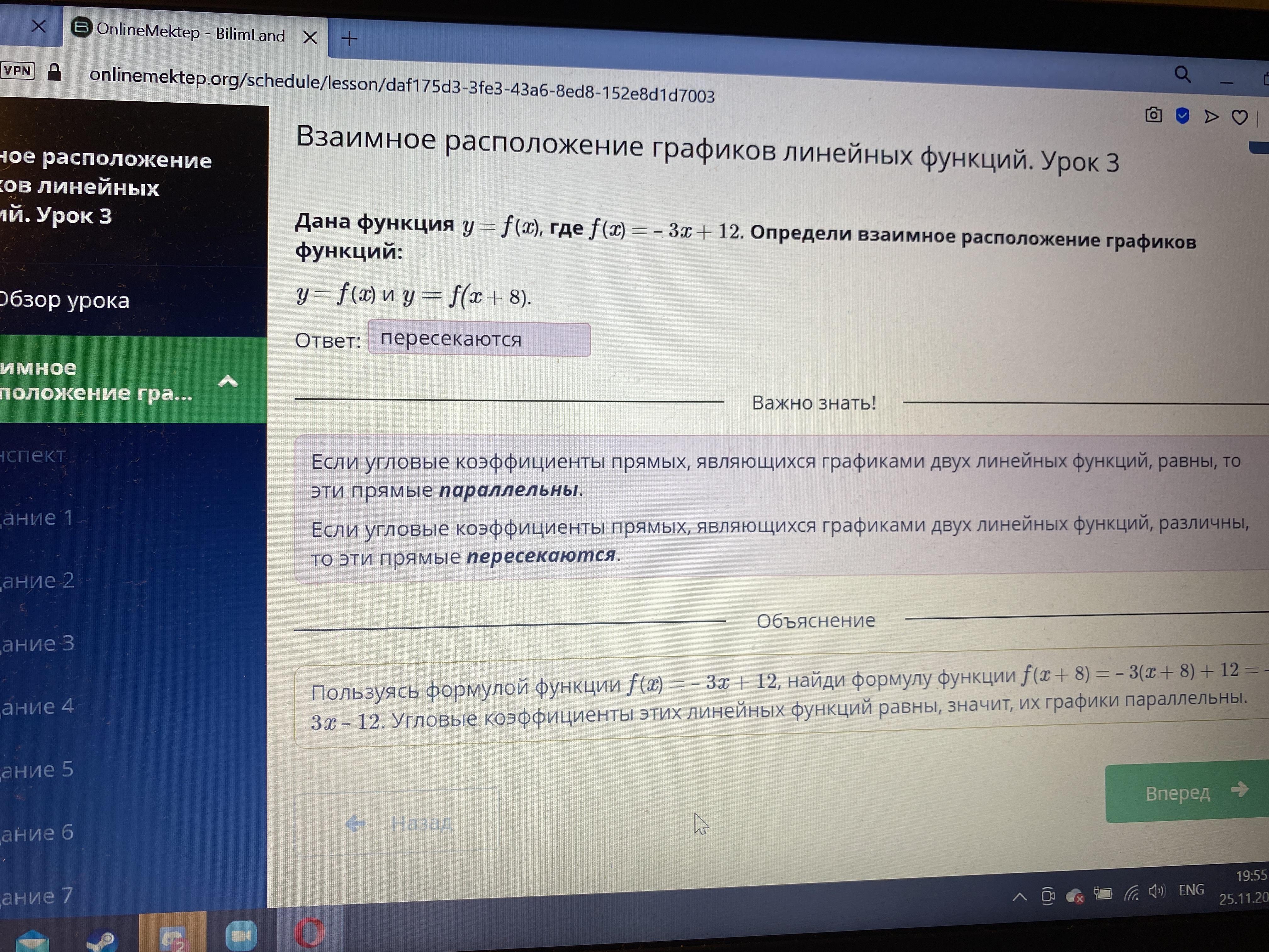 Дана функция y = f (x), где f (x) = – 3x + 12. Определи взаимное расположение графиков функций: