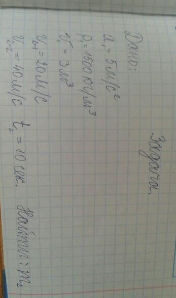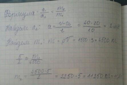 Ускорение первого тела 5 м/с2, плотность 1500 кг/м3, объем 3 м3. Скорость второго тела изменилась за 10 секунд от 20 до 40 м/с. Найти массу второго тела.