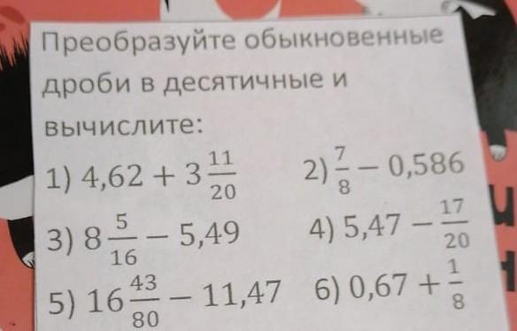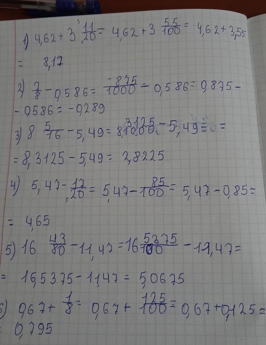 1)4,62+3 11/20 2)7/8-0,586 3)8 5/16- 5,49 4)5,47-17/20 5)16 43/80 - 11,47 6) 0,67+ 1/8